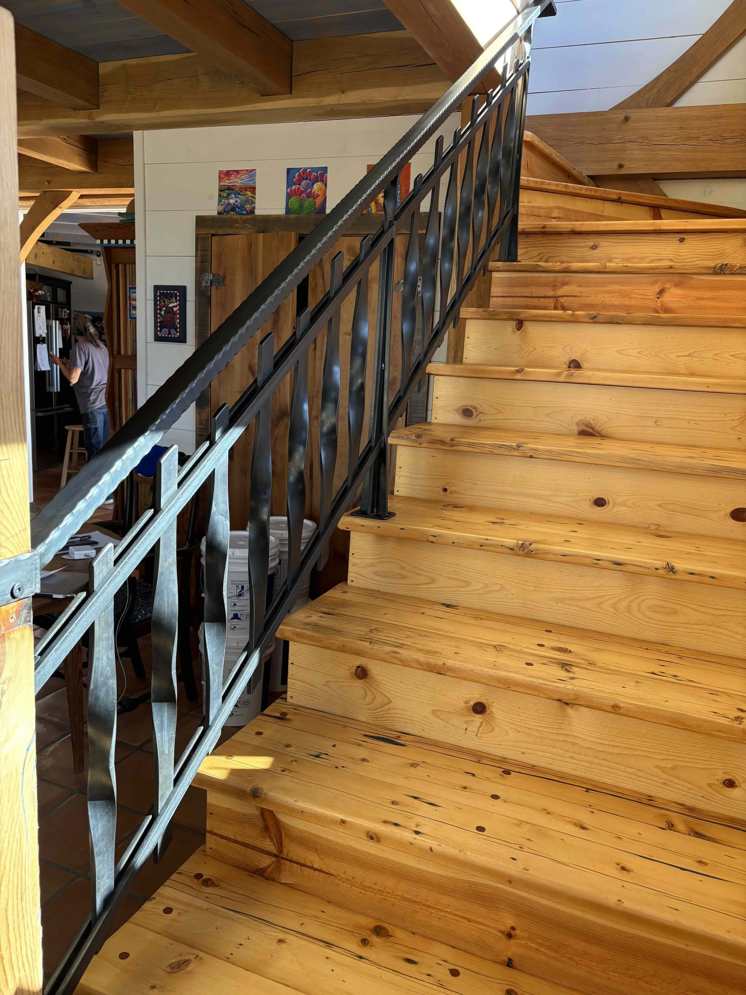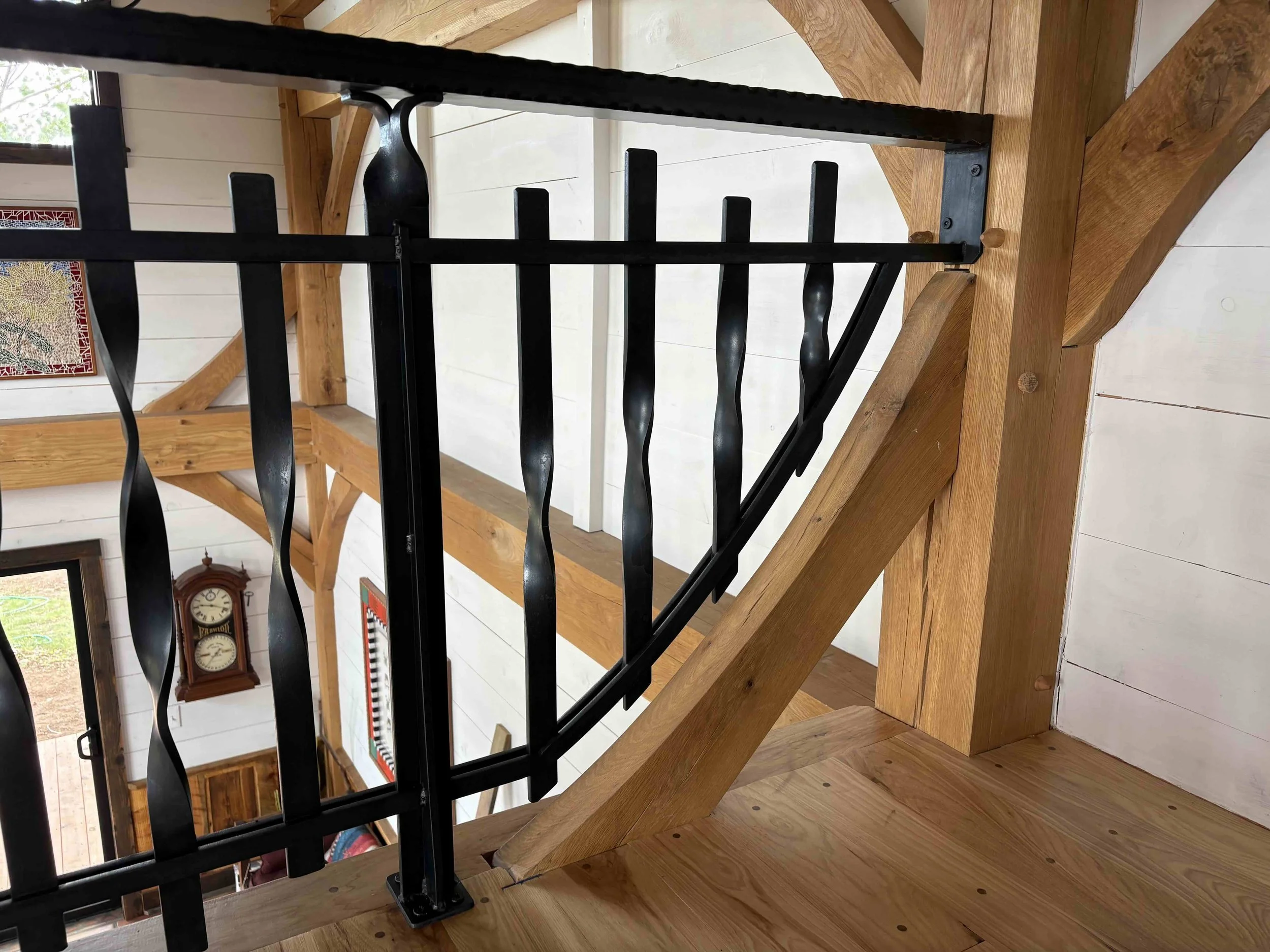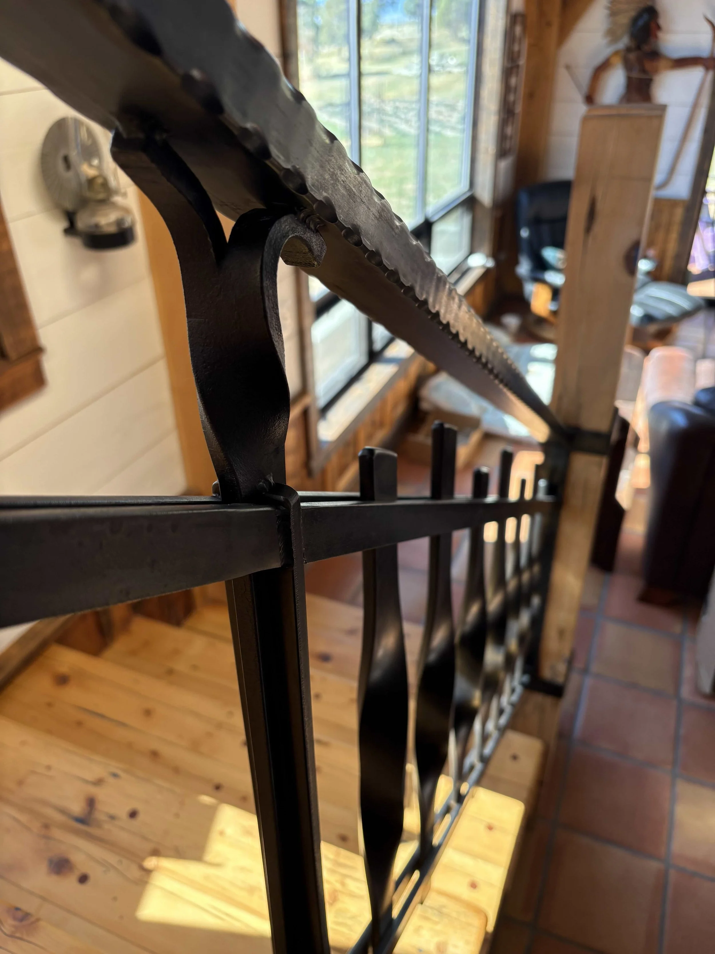 Interior balcony and stair railing. Forged pickets and posts, pre-hammered topcap.